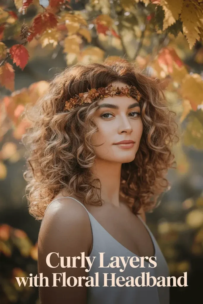 Curly layered hairstyles paired with a floral headband create a romantic and fresh look. The floral details bring softness and feminine charm, making this a perfect choice for autumn picnics, brunch outings, or festive events. The layers give the curls structure and definition.