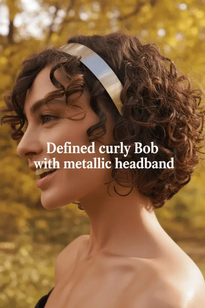 A defined curly bob paired with a thin metallic headband creates an elegant and structured look. This style works especially well for women with short to medium curls who want sophistication with minimal effort. The metallic band adds subtle shine without overwhelming the curls.