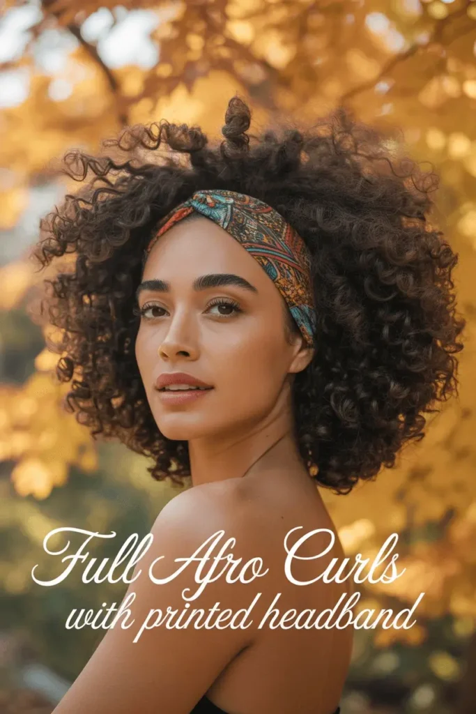 Afro curls paired with a printed headband create a bold, vibrant, and expressive hairstyle. The headband allows the curls to expand naturally while adding personality through patterns such as florals, geometric prints, or fall motifs. This style celebrates natural texture while maintaining a seasonal aesthetic.