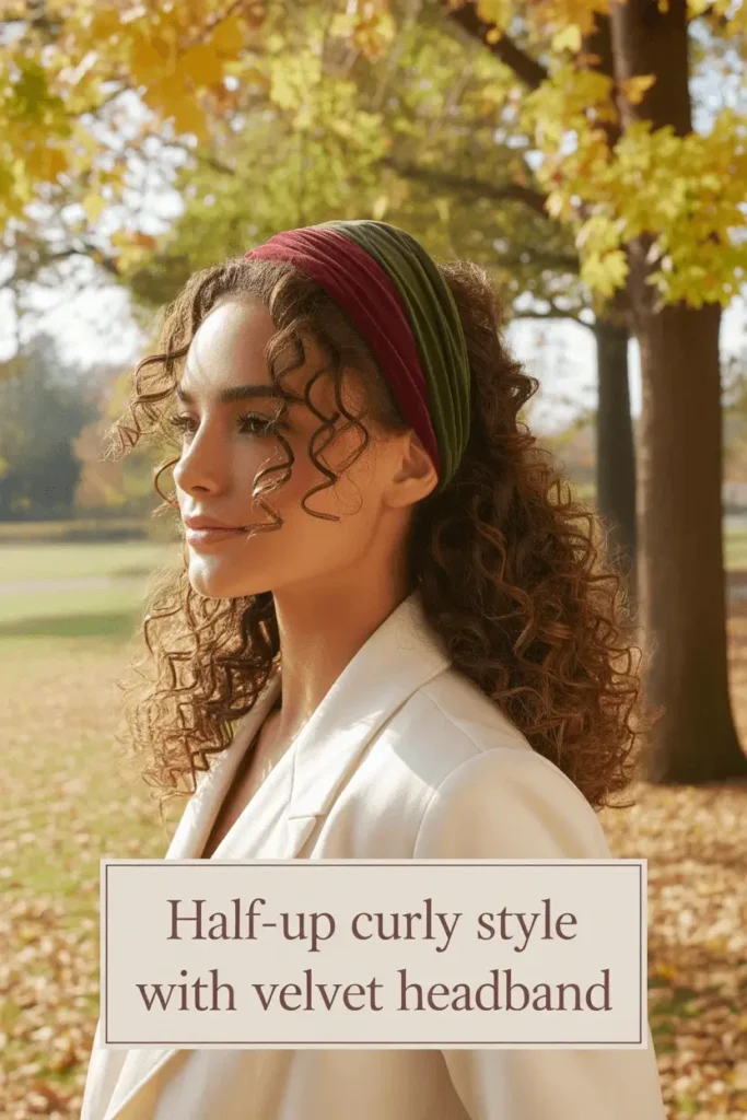 A half-up curly hairstyle paired with a velvet headband brings together classic charm and contemporary style. Velvet has a rich texture that perfectly complements curly volume and fall-inspired looks. This style creates a balanced combination of elegance and comfort.