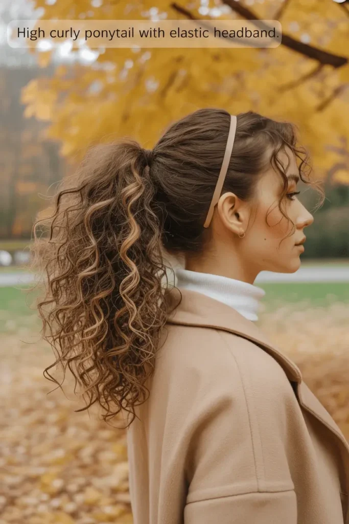 A high curly ponytail paired with a thin elastic headband gives an energetic, youthful, and clean look. The headband helps manage curls around the hairline while highlighting the ponytail’s natural bounce and fullness. This style is perfect for women with active lifestyles or those who love a sporty yet chic vibe.