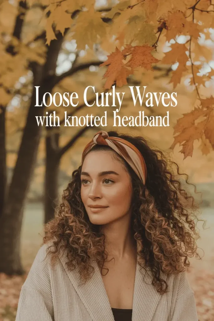 Loose curly waves paired with a knotted headband create a soft, feminine, and elegant hairstyle. The knotted headband acts as a focal point while allowing the curls to flow naturally. The knot adds a fashionable touch, especially popular during autumn styling when textures and details become more expressive.