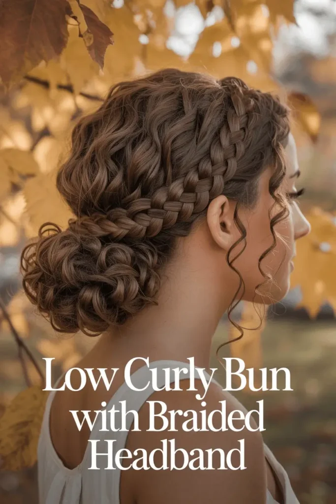 A low curly bun paired with a braided headband creates a romantic, sophisticated, and textured hairstyle. The headband adds an elevated twist while the curls gathered into a bun create softness and elegance. This hairstyle is ideal for fall weddings, dinners, and special events.
