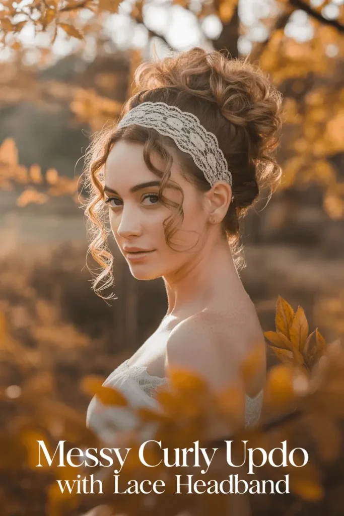 A messy curly updo paired with a lace headband creates a delicate, vintage-inspired look. The lace adds softness and elegance while the messy curls give a carefree, romantic touch. This blend is especially fitting for fall weddings and seasonal gatherings.