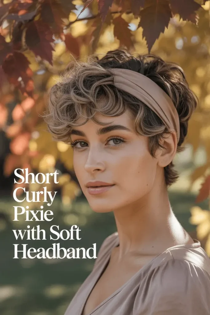 A short curly pixie paired with a soft, flexible headband offers a cute, modern, and easy-to-maintain hairstyle. The headband adds a touch of style while keeping shorter curls in place. It’s perfect for women who want low-maintenance yet fashionable looks.