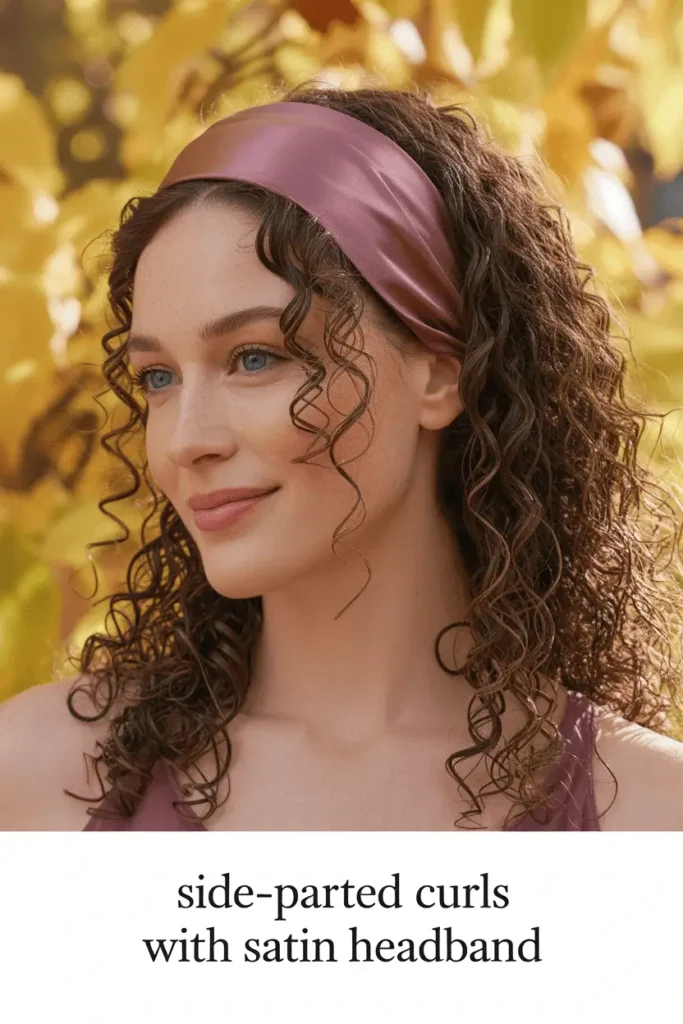 The side part softens facial features and enhances symmetry. Satin headbands are lightweight and gentle on curly hair, making them a protective choice. The subtle gloss of satin complements the warm tones of fall beautifully.