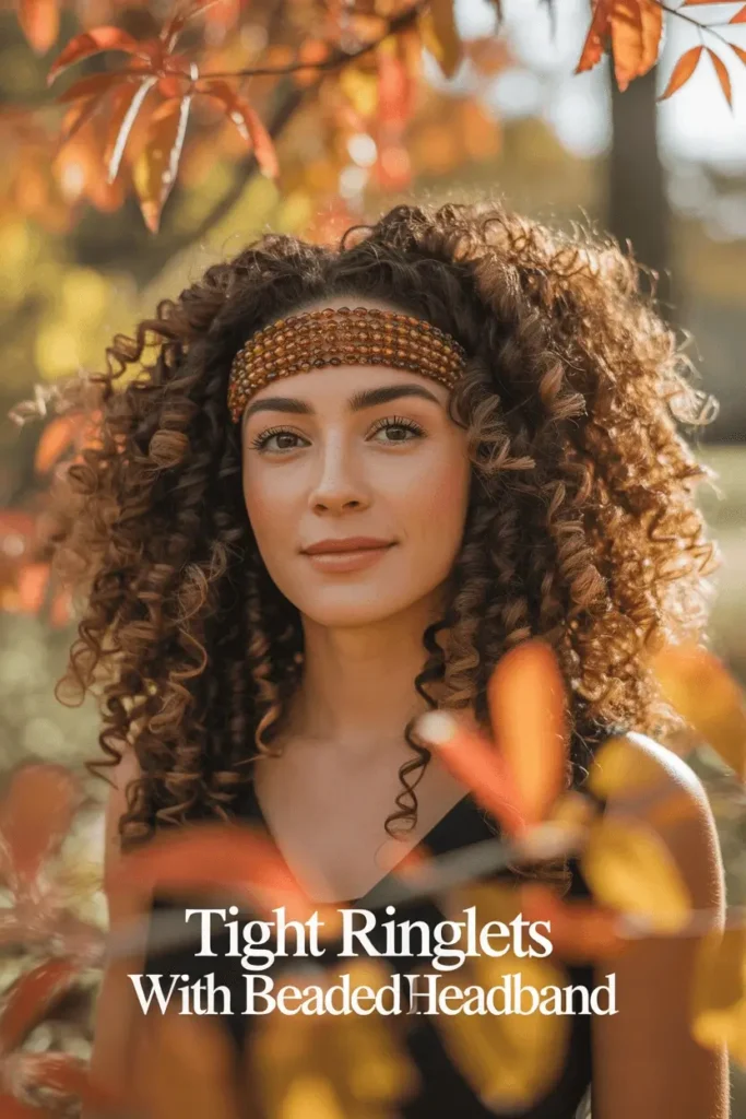 Tight ringlets paired with a beaded headband create a charming, decorative, and festival-inspired hairstyle. The beads add texture and sparkle while maintaining an organic and earthy feel suitable for fall. This look is ideal for women who appreciate artistic styling details.